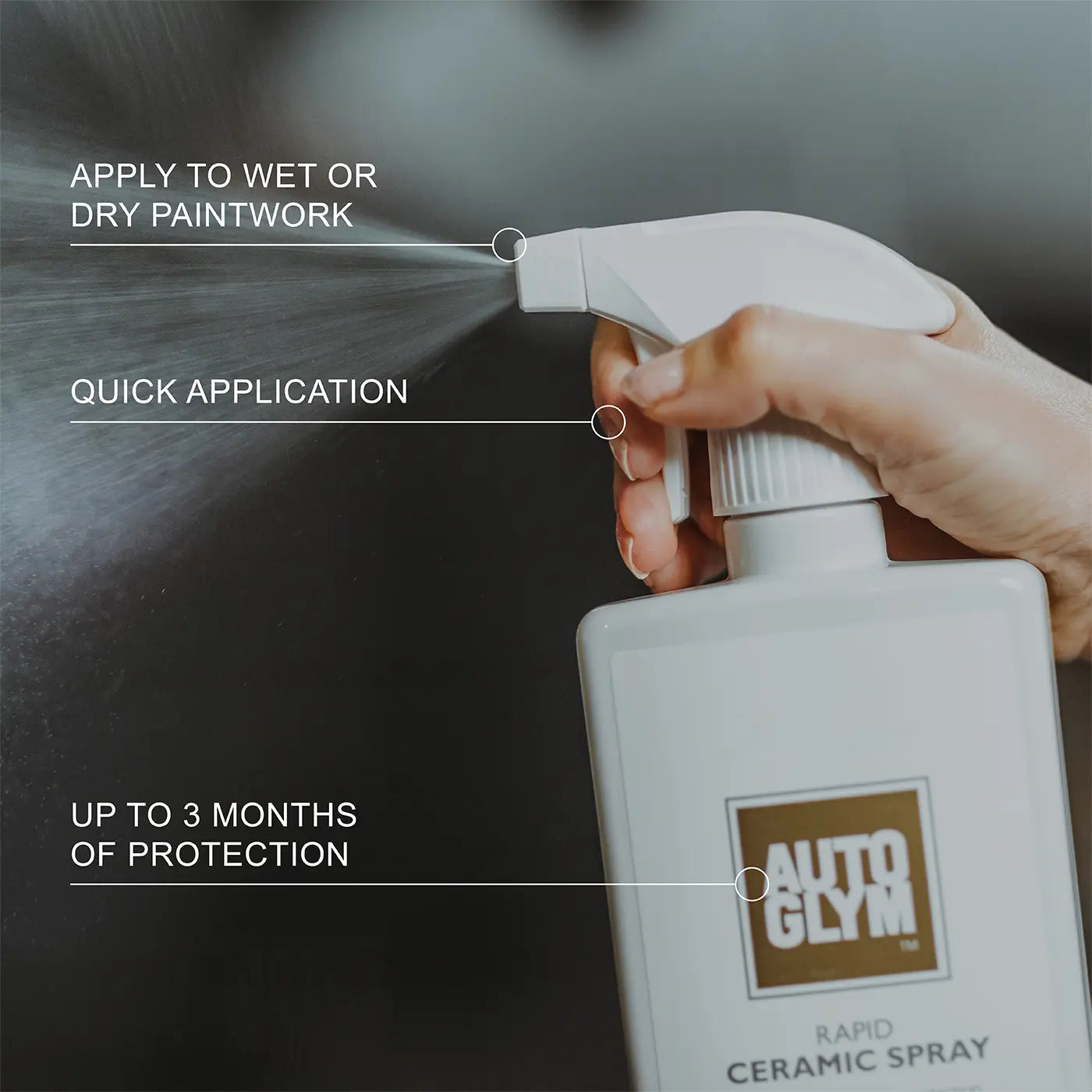Applying ceramic protection often takes time to achieve the best results. Rapid Ceramic Spray is a quick and easy way to add protection to your paintwork. The ceramic hybrid formula quickly bonds to the paintwork with a simple spray and microfibre buff. The tropical scented coating product offers up to 3 months of durable hydrophobic protection, and the unmistakable deep gloss finish will make your car stand out from the crowd.