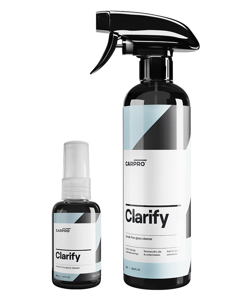 CarPro Clarify is formulated to provide streak free glass with less effort! Lets face it… nobody likes cleaning glass… Until now! With this new easy to use and streak free formula, glass cleaning is no longer such a chore and it certainly doesn’t hurt that the smell is so pleasant! Not only does Clarify wipe off with ease but it won’t damage your ceramic coating or windshield sealant! Whats more, it cuts through traffic film, oils, and fingerprints with ease! CarPro Clarify is safe to use on the interior and exterior of your glass, leaving streak free results and perfect clarity every time!