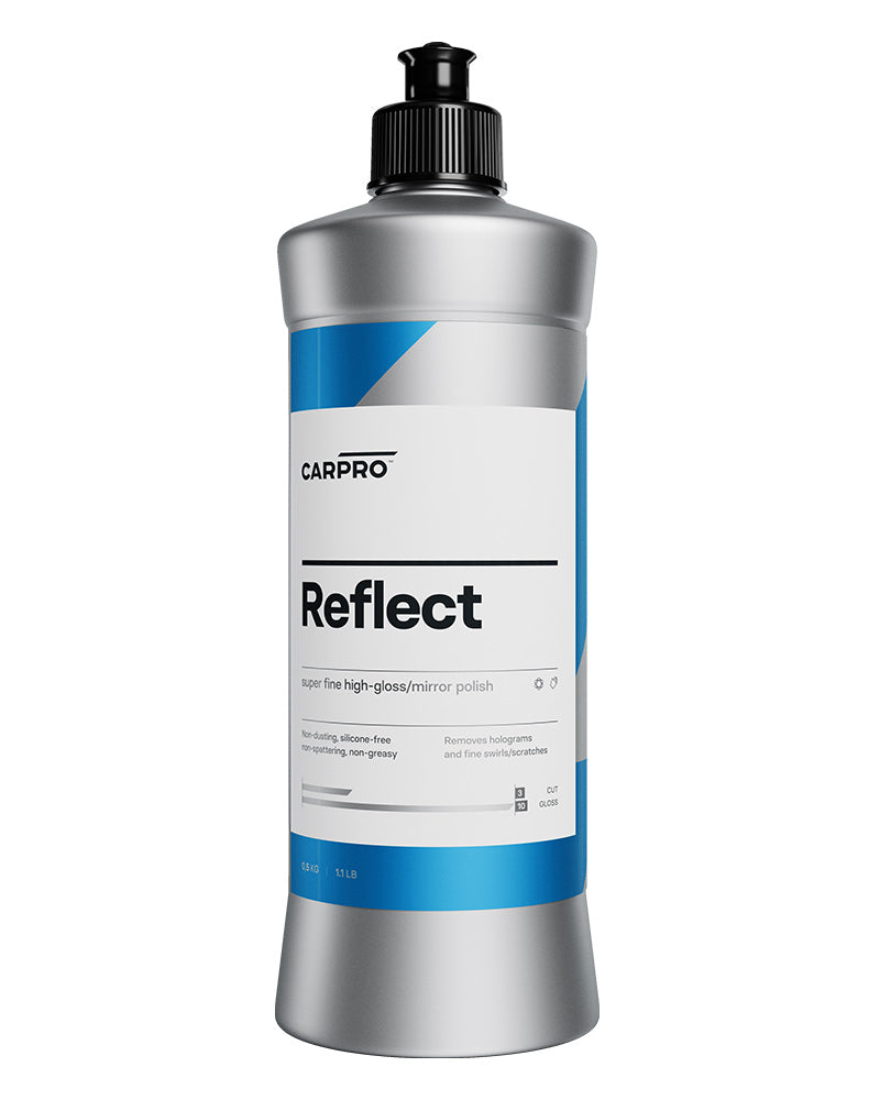 CarPro Reflect 500ml – Super Fine Gloss Polish – Super Fine Gloss Polish quickly and easily creates an incredibly high gloss finish that must be seen to be believed! Comprised of diminishing abrasive technology, Reflect removes light swirls, holograms, and compound haze while producing a reflective extremely high gloss mirror finish in its place. Best of all CarPro Reflect 500ml – Super Fine Gloss Polish is not oily and does not contain durable fillers that interfere with your true results