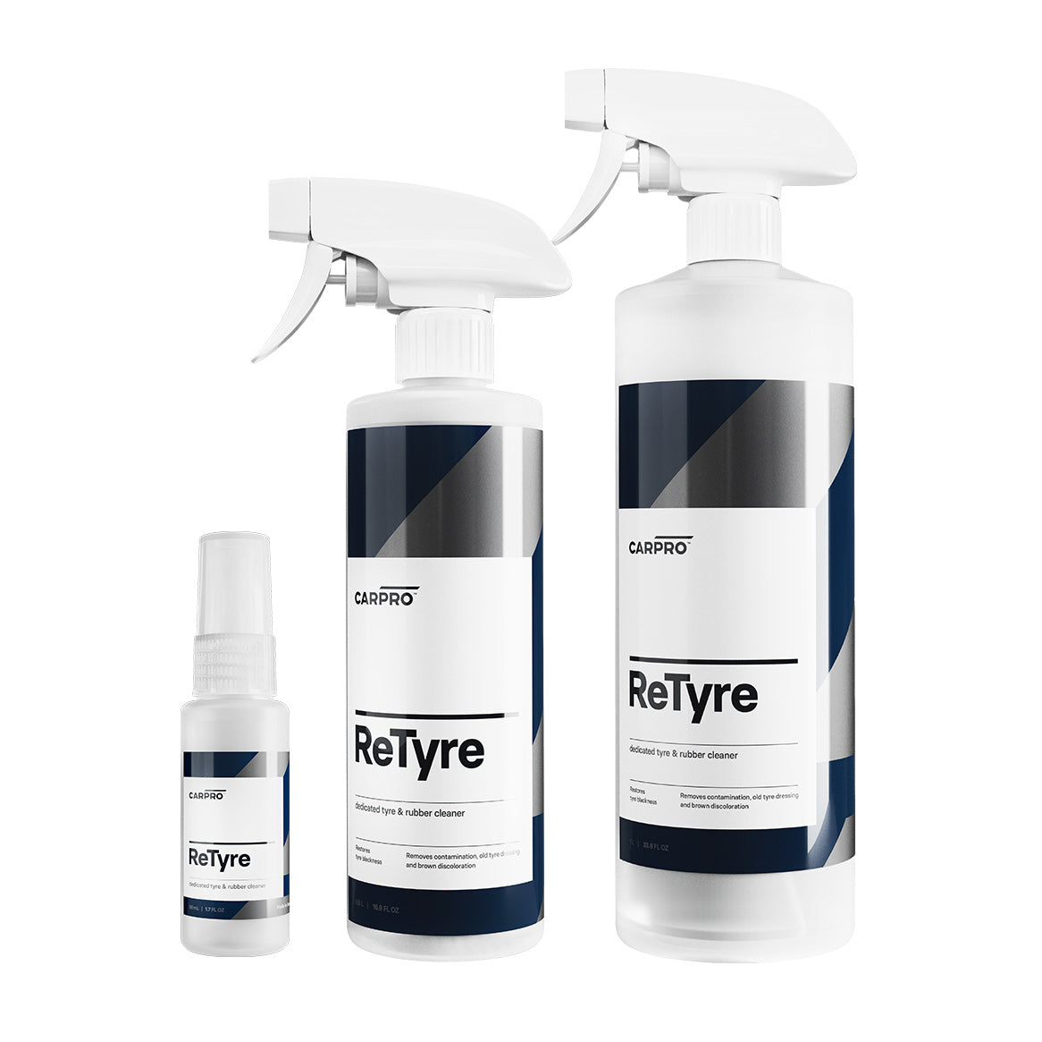 CARPRO ReTyre was designed from the ground up specifically for the easy cleansing of tires from accumulated tire dressings, road film, and browning antioxidants. ReTyre from CARPRO provides a sparkling clean new tire look and prepares the surface to apply BlackOut, Perl or your favorite tire sealant. Tire sealants, coatings, and dressings respond much better to a perfectly clean tire and in the case of CQUARTZ BlackOut it is absolutely imperative for a full bond!