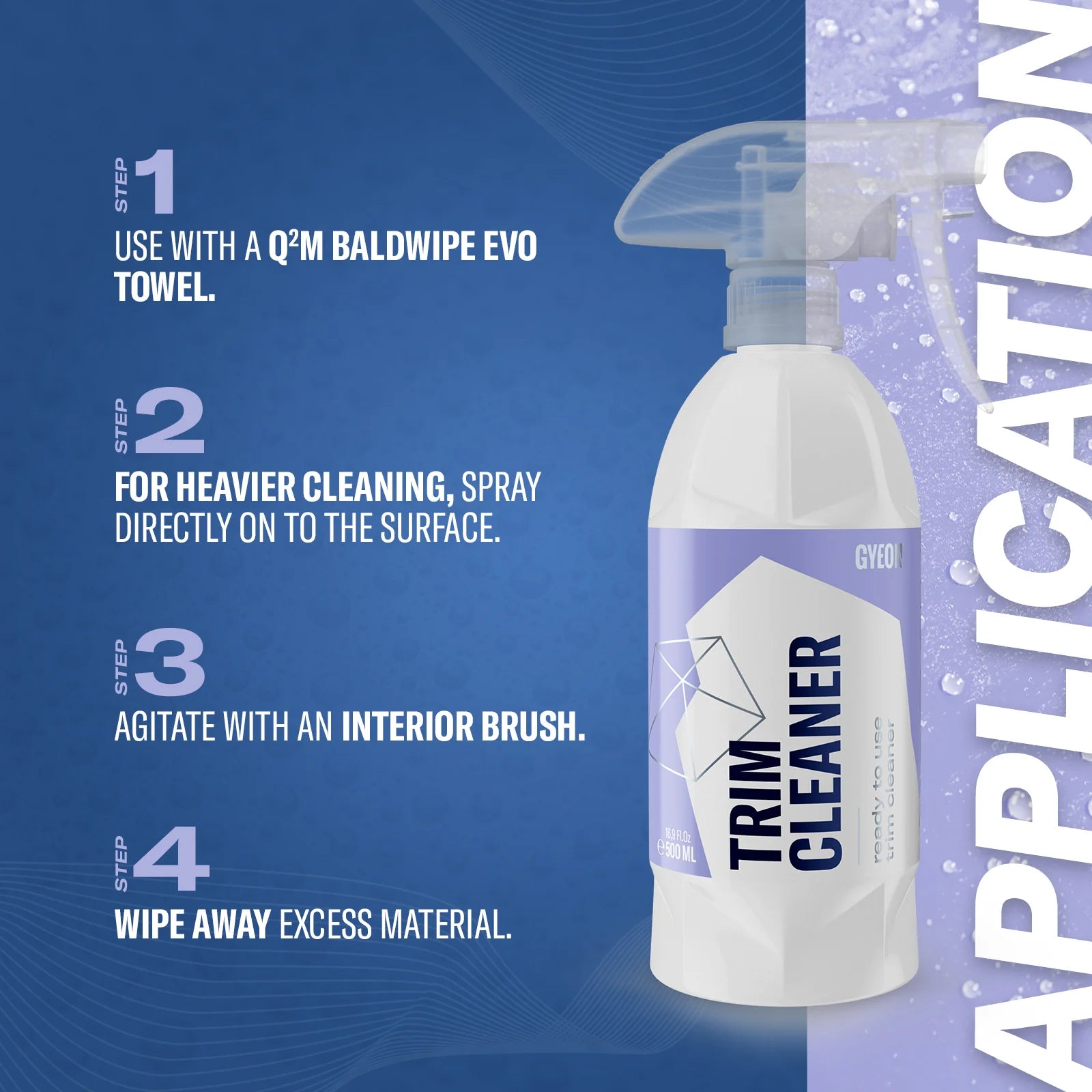 Use on the Q²M BaldWipe EVO for a daily wipe on interior trim. Agitate with a brush or Q²M ScrubPad EVO and let dwell on rubber or exterior trim to enhance the cleaning power. TIP: Q²M TrimCleaner is a perfect deep cleaning for interior trim, leaving a matte and factory-fresh look prior the protection of choice