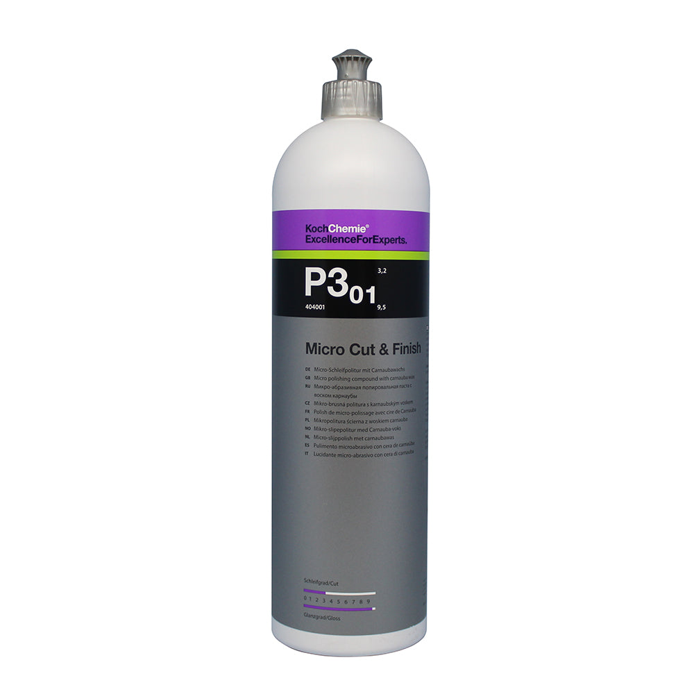 Micro Cut & Finish is the latest generation machine micro-polish for the permanent removal of streaks, holograms, fine scratches and sanding marks to P3000 grain size on all paint systems (including scratch-resistant) with simultaneous long-term sealing with high degree of gloss and smoothness. Through the use of highly specialized, extremely homogenous abrasive bodies, a brilliant permanent high gloss finish is created under extreme light conditions even on dark and similarly sensitive shades. Holograms and fine scratches are eliminated mechanically and not, which is often the case, covered over. Micro Cut & Finish is economical, easy to polish and to remove. Contains carnauba wax and non-fugitive silicones. Cut: 3,2 Gloss: 9,5