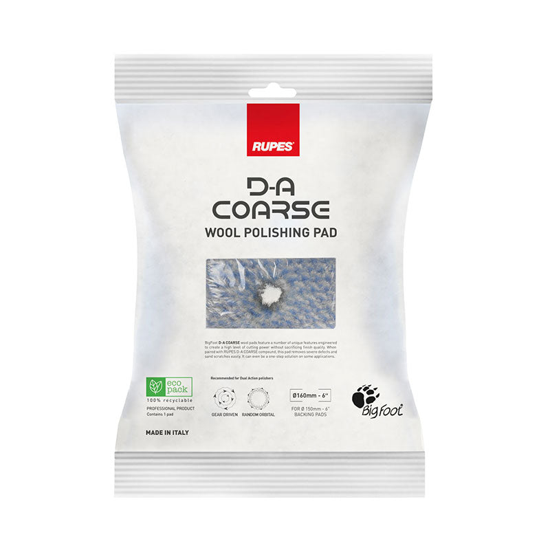 BigFoot DA Coarse Wool Pads feature a number of unique features engineered to create a high level of cutting power without sacrificing finish quality. When paired with DA Coarse Polishing Compound, this pad removes severe surface defects sand scratches easily. It can even be a one-step solution on some applications.